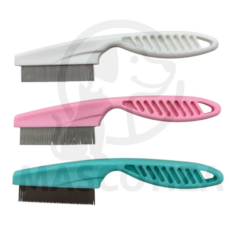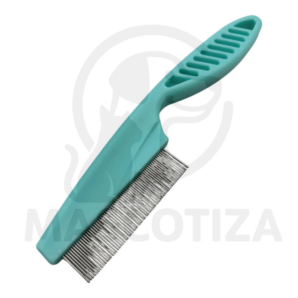 Esta peineta es una herramienta especializada diseñada para eliminar pulgas y otros parásitos del pelaje de tu perro de manera efectiva. Su diseño preciso permite un peinado minucioso que ayuda a mantener la salud y el bienestar de tu mascota, facilitando la detección y remoción de insectos sin irritar la piel. Ideal para el cuidado regular y la prevención de infestaciones.